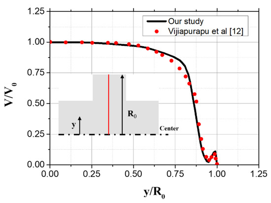 The experiment was conducted using water in a Reynolds number range of 43,000 to 70,000. The pressure difference was measured at the inlet and outlet of the pipe. Since it was turbulent flow, the pressure difference was measured for 3 min due to the fluctuation of the measurement, and it was represented as the average value. Table 3 represents the results of the experiment with those of the numerical analysis. The value of friction factor by experiments and numerical analysis are represented as fexp and fnum and correlates with 95.5% to 98.9%. The results of the experimental and numerical studies demonstrated a similar tendency within an error range up to about four percent. In addition, to validate the turbulence model we used, the velocity distribution inside the corrugated pipe was compared. Figure 6 shows the comparison of the velocity profile at the center of the groove between our study and Vijiapurapu et al. [12] where, V is the velocity distribution, V0 is the velocity at the center line, and R0 is outer the corrugated pipe radius. The velocity profile differs by up to 8.5%. The numerical method has been validated.