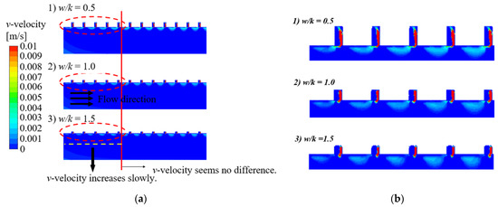 The velocity vector and distribution for corrugated pipe inside the groove: (a) The velocity vectors in the groove for the various ratios of w/k and (b) its v-velocity distribution.