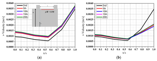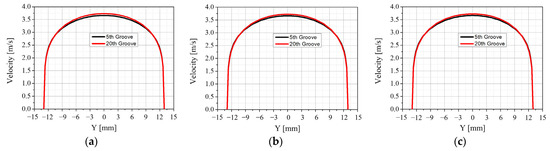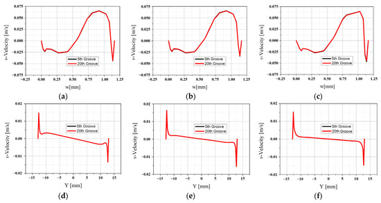 The v-velocity distribution in the 5th and 20th grooves for each case was compared in order to analyze them in more detail. Figure 15 shows v-velocity distribution at the 5th groove and 20th groove at the interface. Figure 15a–c represent the v-velocity at the interface, and d–f represent the v-velocity at the end of the groove. There is no difference between the 5th and 20th v-velocity distributions. This indicates that the flow out of the groove after the collision has little effect on the flow of the next groove.