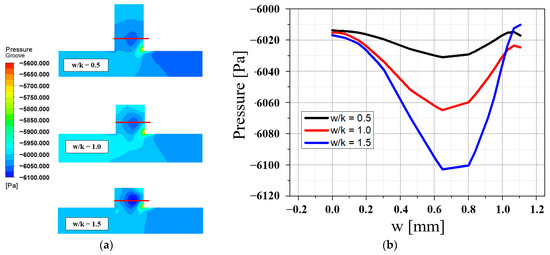 Pressure distribution for different w/k; (a) Pressure contour near the groove, (b) Pressure distribution at the groove center.