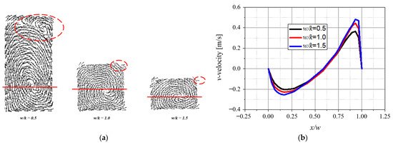 Figure 10 a,b illustrate the velocity vectors in grooves and v-velocity profiles at the red line, respectively. The lower the height, the larger the peak values of v-velocity. The velocity vector plot shows that the secondary vortex occurs in the upper right corner. These secondary vortexes are all different in shape according to the change in groove height. The change in the positive peak value shows more differences than the change in the negative peak value. The region of the secondary vortex is more significant as the groove height increases. Moreover, the secondary vortex rotates opposite to the primary vortex. Due to the secondary vortex, the difference between the positive peak values occurs according to the height.