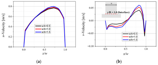 Velocity distribution at interface for different w/k. (a) U-velocity distribution at interface line for different w/k, (b) v-velocity distribution at interface line for different w/k.