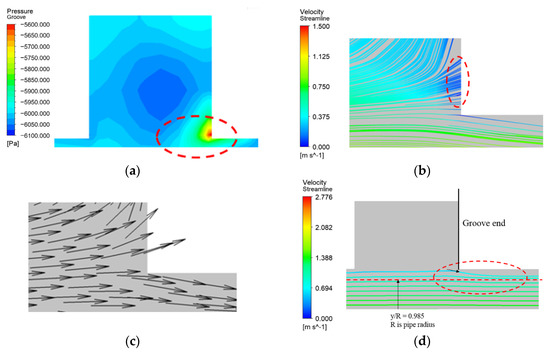 High-pressure region on groove corner. (a) the pressure contour at the groove, (b) the streamline at the lower right corner of the groove, (c) the velocity vector near the groove, and (d) the streamline of the main flow.