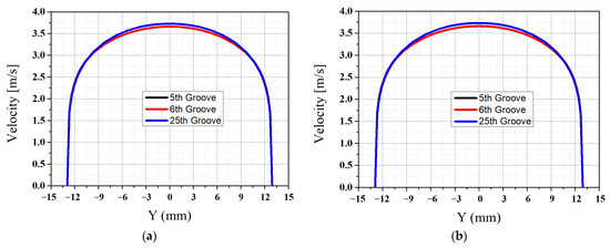Figure 14 is a result of a comparison of the v-velocity profiles by the groove pitch at the 5th groove and 20th groove interfaces. The difference for each pitch is insignificant, and the v-velocity distribution at the 5th and 20th have similar trends.