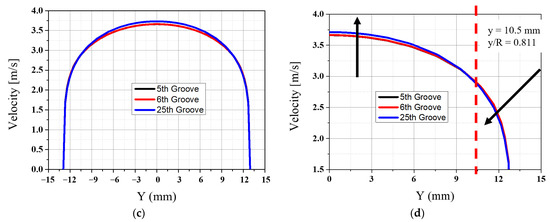 Therefore, the velocity distribution of the main flow will be different due to the maximum negative v-velocity. Figure 13a–c are the main flow velocity distributions at the end of the groove for w/k = 0.5, 1.0, and 1.5, respectively, and (d) is an enlarged figure of w/k = 1.5. When comparing the velocity distribution at the end of the 5th and 6th groove, there is no difference in the velocity distribution. However, when comparing the 5th and 25th velocity distributions, the main flow velocity profile increases when y/R < 0.811 and decreases the range of 0.811 < y/R. This means that when passing through a single groove, the deformation of the main flow is small because the maximum negative v-velocity is lower after the collision. However, the flow after the collision still affects the main flow. Thus, this effect cannot be ignored if the number of grooves increases.