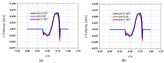 Comparison of v-velocity distribution at groove interface for different p/k: (a) Comparison of v-velocity distribution at 5th groove interface for different p/k, (b) Comparison of v-velocity distribution at 20th groove interface for different p/k.