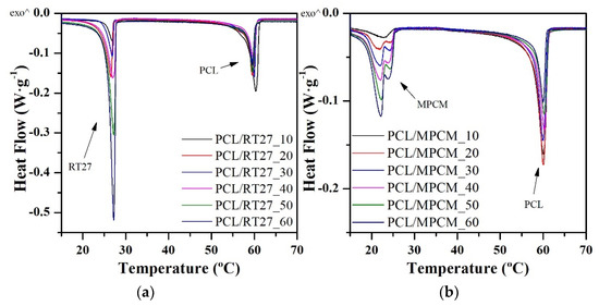 (a,b) Heat flow curves of RT27 and MPCM blends, respectively.