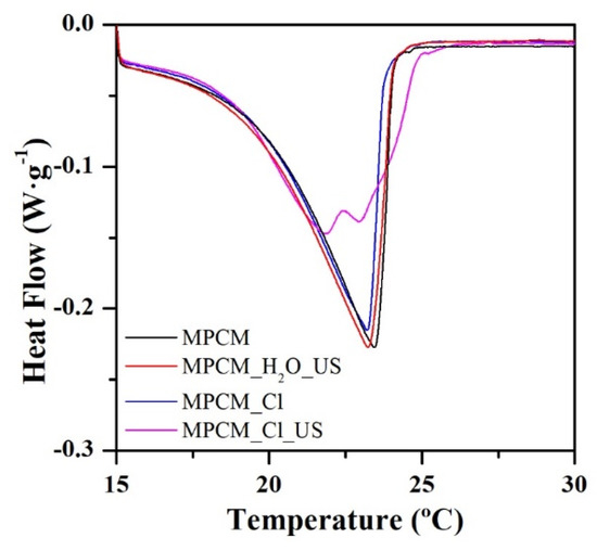 Heat flow curves of MPCM, MPCM_H2O_US, MPCM_Cl, and MPCM_Cl_US samples.