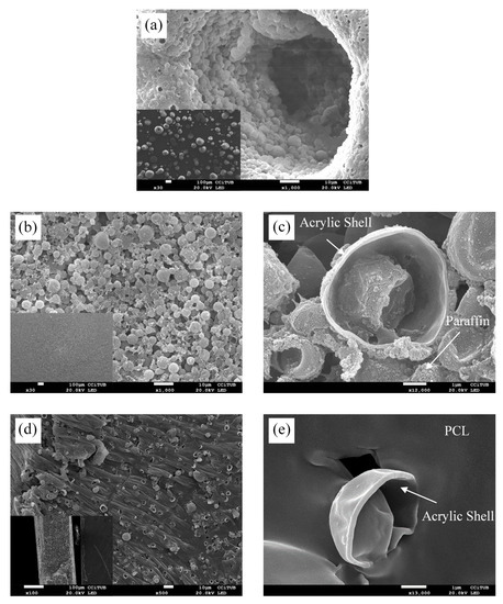 To corroborate that MPCM shells were broken, samples were observed with SEM. Figure 4a shows that the sample is an aggregation of microcapsules forming macrocapsules. Figure 4b,c show the MPCM_Cl_US sample, while Figure 4c is a detail image of the Figure 4b. The distribution of the microcapsules is homogeneous and some of them are broken and some paraffin is outside the shell. Figure 4d,e show the fracture surface of the PCL/MPCM_10, where Figure 4e is a detail image of the Figure 4d. The microcapsules are homogeneous and well-dispersed in the PCL matrix, but some of the micro capsules are broken.