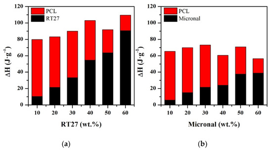 Figure 5 presents the enthalpy of the matrix and the filler of the different blend manufactured. As expected, the higher RT27 and MPCM content, the higher PCM enthalpy and the lower matrix enthalpy. In contrast, the total enthalpy of the manufactured blends is ideally expected to increase linearly by increasing the PCM content. However, the efficiency of PCM inclusion is not 100% under experimental conditions. For that reason, the increment trend is not linear.