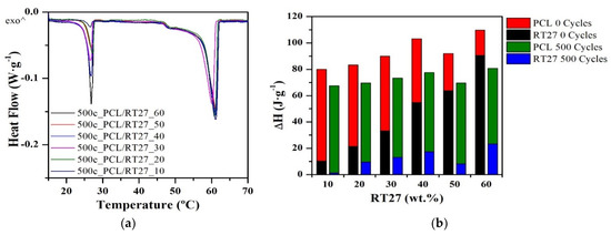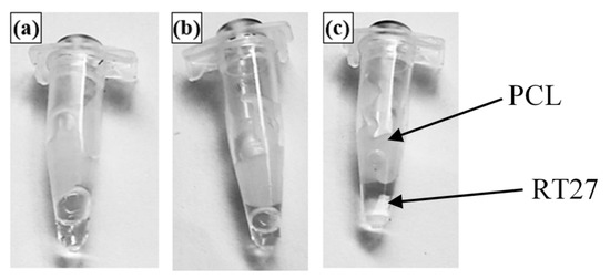 The heat flow curves and the evolution of the enthalpy and melting temperature of the samples with RT27 before and after the thermal cycling can be seen in Figure 6. While Figure 6a shows no variation in the melting peaks of the RT27 CSS-PCM, Figure 6b presents a decrease of enthalpy between 88% and 55% with respect to the non-cycled results in all samples. The highest enthalpy decrease is observed in PCL/RT27_10, PCL/RT27_50 and PCL/RT27_60 with a drop of 88%, 87% and 74%, respectively. Migration of the RT27 from the PCL is observed in PCL/RT27_40, PCL/RT27_50 and PCL/RT27_60 formulations, as can be seen in Figure 7, showing a phase separation with the RT27 in liquid state at 30 °C. With respect to the matrix, neither the enthalpy nor the melting temperature of the PCL present variation before and after the thermal cycling.