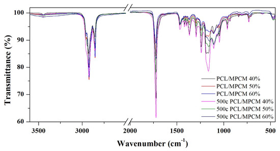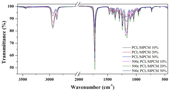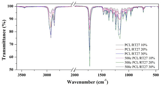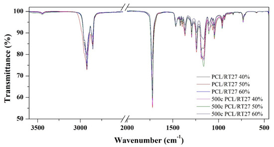 The chemical stability of the samples after the thermal cycling was evaluated by the FT-IR. Figure 8 and Figure 9 show the FT-IR spectra of the RT27 CSS-PCM before and after 500 thermal cycles. The main bands detected related to PCL are the C–H bonds in the –CH2 stretching bands (2943–2866 cm−1), the –C=O stretching band (1722 cm−1), the –C–H bond in –CH2 bending bands (1470–1460 cm−1), the C–O and C–C stretching bands (1293 cm−1), the C–O–C stretching bands (1239–1164 cm−1), the OC–O stretching (1190 cm−1), the C–O stretching band, corresponding to the ester group vibration, (1108 cm−1) and –CH2 rocking bands (760–700 cm−1) [25,26,27]. The main bands detected related to RT27 paraffin content are the alkyl stretching bands (2956, 2920, and 2851 cm−1) [28]. In the blends samples, the presence of the bands from both materials is detected and no new bands corresponding to new chemical bonds due to a reaction between the two raw materials are observed. Hence, a physical blend is obtained in all cases. After the thermal cycling, the samples show the same bands. The thermo-oxidative degradation cannot be determined due to the presence C–O stretching band, since this band is the indicator band of thermo-oxidative degradation.