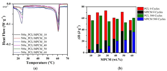 Figure 10 presents the heat flow curves and the evolution of the enthalpy and melting temperature of PCL/MPCM samples. In Figure 10a it can be seen that one peak is detected, meaning shell breakage and that paraffin is outside the microcapsules and is blended in the PCL matrix. As detected in the PCL/RT27 samples, the thermal cycled samples present lower values of PCM enthalpy than the non-thermal cycled, around 46% to 22% less, as shown in Figure 10b. The decrease of the enthalpy could be due to homogeneity loss of the mixture. The highest enthalpy decrease is observed in PCL/MPCM_30 and PCL/MPCM_50 with a drop of 46% and 41%, respectively. However, no phase separation is detected in any of the formulations. No variation of the matrix enthalpy is detected before and after the thermal cycling. The melting temperature is slightly higher after the thermal cycling.