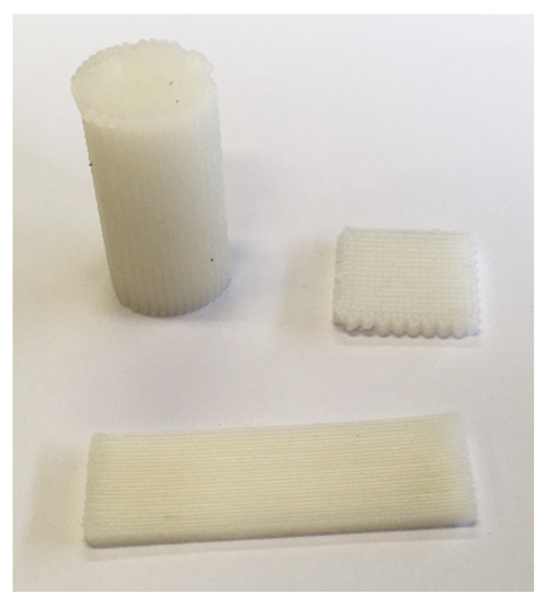 The shaping method evaluated was 3D Printing employing the technology Material Extrusion Granulate. The 3D printing was done with the 3D bioprinter (3D Discovery regenHU). The PCL/RT27 composite is fed into a chamber where it is melted. With compressed air and a rotating screw, the material is extruded through a nozzle tip. 120 °C temperature was applied to melt the blends and acquire the proper fluidity. The air pressure used was 3 bar, the screw velocity was 30 rev·min−1, the printing rate was 3 mm·s−1 and the diameter of nozzle tip was 330 μm. Three different structures were built: woodpile (15 × 15 × 2.5 mm), cylinder (90 × 2.8 mm) and plate (35 × 12 × 2 mm).