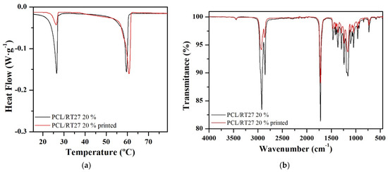 PCL/RT27_20% blend (a) Heat flow curves before and after the printing step; (b) FT-IR spectra before and after the printing step.