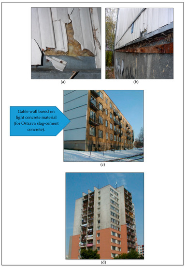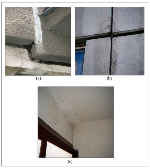 Since their construction, the prefab external walls have been gradually exposed to the menace of condensed water vapor hidden inside the external wall structure. This, in conjunction with reduced internal surface temperature, volume changes and increases in mass moisture of the material, has led to significant degradation and reduced life of the external walls. If we add to these shortcomings the deficient thermal protection of roofs and windows and failures of contact points and joints, it then becomes clear why the prefab residential buildings were considered to be very poor quality housing (Figure 5a–c, Appendix C, Figure A4a,b).