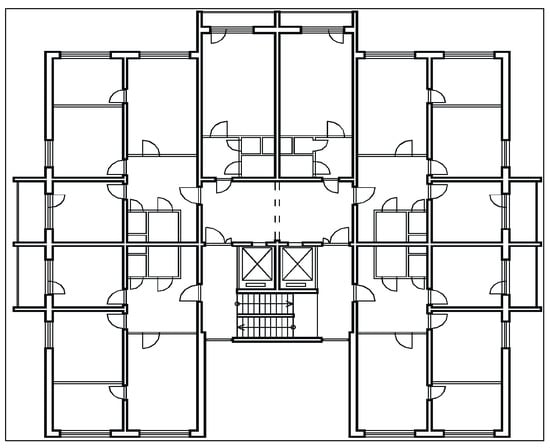 A similar lamella cladding appeared in the 1980s in the high-rise construction of prefab residential housing buildings, which were very fragmented in the floor plan (see Figure 2) and the structural arrangement of transverse and longitudinal walls created systematic thermal bridges in the external cladding (Figure 1d). Such cladding was used only up to the sixth aboveground floor, equivalent to a height of approximately 20.00 m above ground, because the thermal insulation of that time used above the mentioned height did not comply with fire safety regulations, bearing in mind that the material base was very limited at that time.