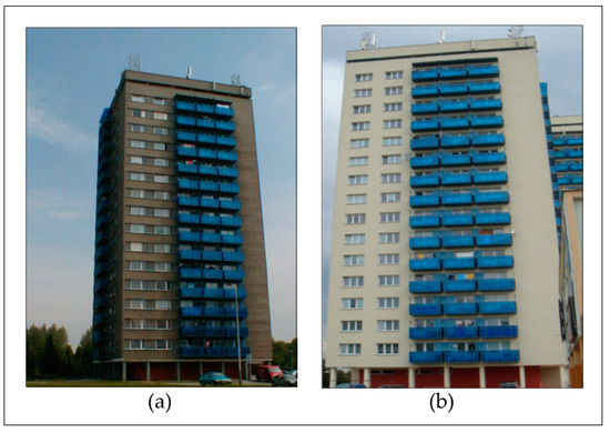 Renovation of prefabricated residential housing buildings using ETICS: (a) Type VM-OS tower prefab panel construction system prior to applying ETICS; (b) type VM-OS tower prefab panel construction system after applying ETICS (Photo source: Author’s archive [29,30]).