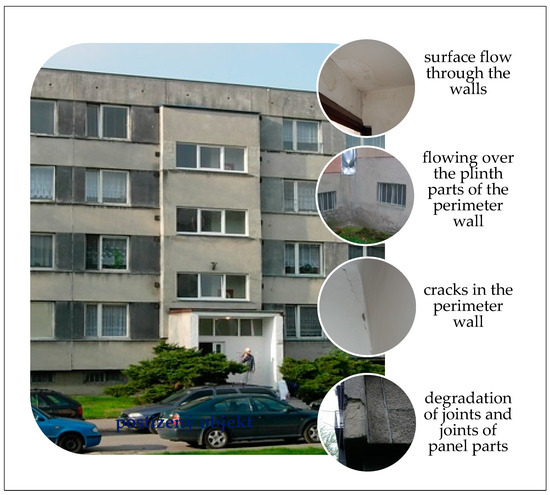 Condition of a prefab residential housing apartment building before the application of ETICS and defects and failures of the external wall (photo source: Author’s archive [29,30]).