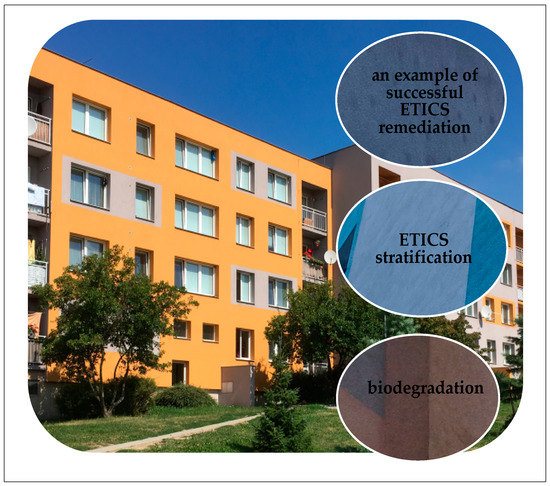 As time has shown, specific modern defects and faults appear in the various time horizons after the application of ETICSs. Biodegradation is one of the most common problems with ETICSs and it is the most common modern disorder. The issue of biodegradation has led to a discussion of how far the increasing thickness of the thermal insulator affects the conditions for colonization of the surface of the external plaster by biodegradation factors such as fungi, algae and lichens. On the one hand, by application of ETICSs, the inter-related building and physical factors contribute to the improvement of the thermal protection parameters of prefab residential housing but, on the other hand, the insulated façade creates suitable conditions for colonization by microorganisms.