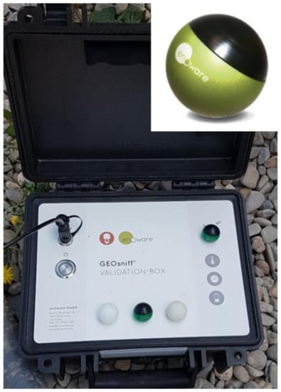The GEOsniff Validation Box with two GEOsniff sensors (green/black balls) and two blind balls (white), which are for checking the recoverability of the real sensors.