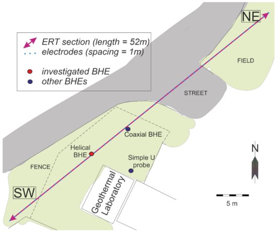 To obtain a more detailed picture of the structure of the surrounding ground, electrical resistivity tomography (ERT) measurements were also carried out over a 52-metre transect that passed over the borehole examined in this study. The results of the ERT measurements and stratigraphic information from the lithological column provide a useful means of validating the results from the DTRT investigation. In the field of geophysics, ERT is a non-invasive technique for determining the electrical resistivity of the ground. It is very sensitive with respect to those parameters that influence the electrical resistivity of the ground, such as the water content, water salinity, mineral composition, and material density [29,30,31,32,33,34].