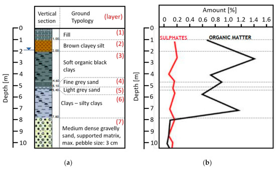 (a) Lithological column at the test site. (b) Results of the organic content analysis.