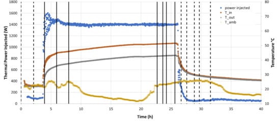 The sky was mostly clear on both the 16th and 17th of May 2018, with almost constant sunshine and an ambient temperature that occasionally exceeded 20 °C during the day (Figure 5). At night, the temperature dropped to around 10 °C. Figure 5 shows that the injection of thermal power remained essentially constant and the measured values of T_in and T_out were practically unaffected by any fluctuations in the ambient temperature.