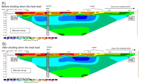 The results of the processed ERT data are shown in Figure 6. The maximum penetration depth achieved over the carried out ERT line according to the Res2DInv output was 8.5 m, which is a little less than the installation depth of the BHE. The errors after the fifth iteration were 3.1% and 2.9%, respectively.