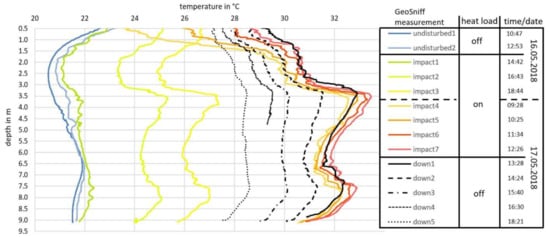The GEOsniff measurements on 16 May 2018 were performed from 10:47 (‘undisturbed1’) to 18:44 (‘impact3’). On the second day, the measurements were carried out from 9:28 (‘impact4’) until 18:21 (‘down5’) (Figure 7). All measurements were performed inside the single-U probe installed at the edge of the borehole of the helical BHE, where the heat load was applied.