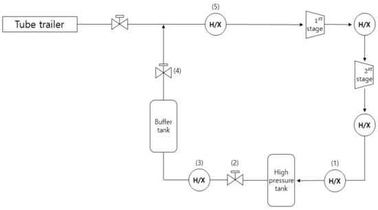 The compression cycle in hydrogen filling returns to the process shown in Figure 1. In this study, the hydrogen supplied at the pressure is compressed to 82 MPa through a compression process, and then the hydrogen is stored in a high-pressure storage tank. This is a system that lowers the pressure and stores it in the buffer tank so the compression cycle can be repeated. Heat is generated during the compression process, storage process and the process of passing the pressure reducing valve. Then, the heated hydrogen is cooled to an appropriate temperature through a heat exchanger. As shown in Figure 1, the first stage and second stage are compressors, and (1), (3), and (5) are heat exchangers, and (2), (4) are pressure reducing valves.