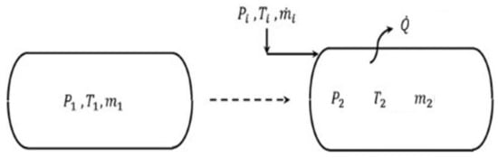 Theoretical model of the high-pressure filling process for the compression hydrogen storage tank, as shown in Figure 3. The initial conditions of the system are as follows: the pressure and temperature of the hydrogen compressed to high-pressure through the compressor is 82 MPa, 313.15 K, and the flow rate is 29.05 kg/h. The size of the high-pressure container that enters the hydrogen filling system is the same, with a length of 4.4197 m, an inner diameter of 0.3143 m, an outer diameter of 0.3985 m, the thickness of 0.0842 m, the volume of 0.343 m³, and thermal conductivity of 16.3 . The initial state of the hydrogen storage tanks is a vacuum state in the first cycle, and there are residual pressures of 11.3 MPa and 11 MPa, respectively, in the second cycle. As for the air temperature, a value of 302.05 K was used to obtain conservative data. For the properties of hydrogen according to the temperature and pressure data obtained through the REFPROP 9.5 [40] program were used.