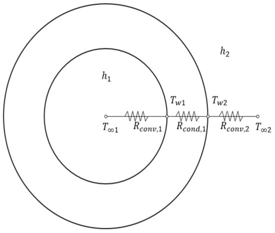 Specific heat coefficients were calculated by using the REFPROP 9.5, a program produced and supplied by the National Institute of Standards and Technology (NIST). The transfer of the tank wall and inner wall consists of three parts, convection between the flow of high-temperature hydrogen in the tank and the tank wall, heat conduction in the wall surface, and convection between the external wall and the surroundings, as shown in Figure 7. Heat transfer between the hydrogen in the high-pressure container and the external air occurs on the surface of the high-pressure container and occurs in the form of conduction and convection. Radiant heat transfer was neglected because of the difference between the surface of the high-pressure tank and the outside temperature was expected to be relatively small [43].