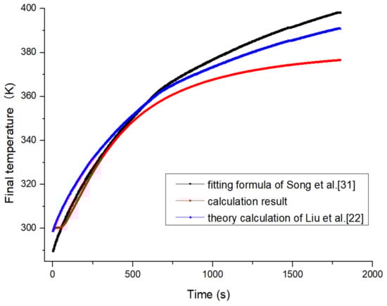 The calculation of final temperature was based on the experimental pressure data from the reference [32]. The final temperature during this time with different equations is shown in Figure 8. It can be seen from the curve in Figure 8 that the curve of the fitting formula of Song et al. [31] is a little higher than the other. The reason for this situation may be ignored heat transfer. In the initial stage of high-pressure filling, the final temperatures have little difference. As the pressure increases, the difference in temperature rise becomes larger.