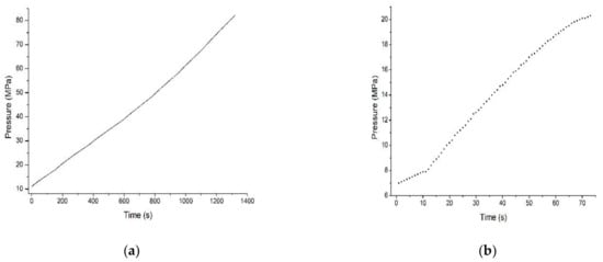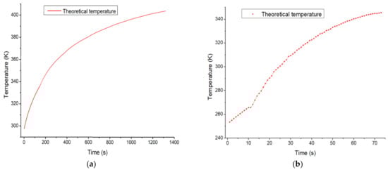 The rise of hydrogen gas pressure over time is shown in Figure 9. It can be seen that the pressure basically increases linearly. Figure 10 shows the corresponding temperature valuations by using an accurate equation for the temperature rise calculation of the storage tank. The upward trends of (a) and (b) are basically the same. The error is obtained from the linear regression of the experimental pressure measurement. In the initial stage of fast-filling, the temperature rises grow rapidly, and as the ratio of the termination pressure to the initial pressure decreases, the temperature rises gradually increases slowly and remains stable towards the end of the filling process.
