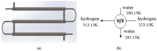 The heat exchanger section is (1), (2) and (5), as shown in Figure 1. The heat capacity required in the firstcycle and the second cycle is the same through the heat exchanger (1). On the other hand, in heat exchangers (3) and (5), the hydrogen that h passed through the pressure-reducing valve flows into the heat exchanger and heat exchange with the cooling water occurs. The required capacity to reach the target temperature was calculated using the Log Mean Temperature Difference (LMTD) method. The working principle of the heat exchanger is shown in Figure 11.