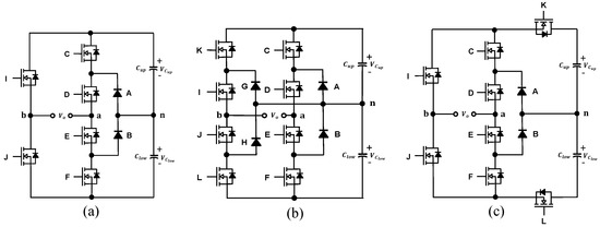 Single-phase NPC five-level converters; (a) conventional simplified-bridge topology [15,16,17,18], (b) full-bridge topology [20,21,22,23,24,25,26], and (c) proposed topology.
