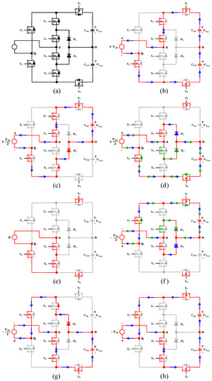 On the other hand, for example, in the SB topology, only three switches stand with either half or even full DC bus voltage; this issue represents a serious inconvenience of the power devices’ stress. Unlike this conventional topology [15,16,17,18] and the FB topology [20,21,22,23,24,25,26], the proposed one has an equivalent of four and six switches at each leg, respectively. According to the switching state, the full DC bus voltage is shared among five switches, whereas half of the DC bus voltage is shared among either four or at least three switches, depending on the active state for the voltage balancing purposes. It is important to remark that this feature inherently represents the advantage of having a lower stress on the switching devices, thus making more feasible the use of MOSFETs instead of IGBTs. The MOSFETs for high power applications are not only less costly than IGBTs but are also capable of working at higher frequencies and more efficiently [10].