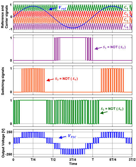 Figure 3 shows the signals of the Multicarrier Phase Disposition PWM modulation strategy [27,28]. The reference or modulating signal and the triangular carrier signals, as well as the switching pattern and the resulting output voltage from the proposed SPFLC can be observed. This graph was obtained with the voltage balancing algorithm deactivated () and without current flow.