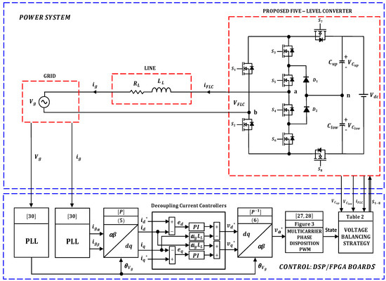 Figure 4 shows the block diagram of the implemented current vector control strategy in the rotating coordinates for the proposed single-phase five-level converter connected to the grid through an line. It can be noted that the voltage component is the only control signal fed into the MPDPWM block, whereas the component is simply disregarded [29]. Considering the equivalent three-phase representation from the one-line single-phase power system shown in Figure 4 and applying the Kirchhoff voltage law to the resulting circuit, the following equation in the stationary frame is obtained [29]: