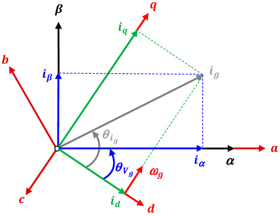 where the three- and two-phase grid current vectors are and , respectively. After applying the direct Park transform (5) to (2), the expanded equations in the rotating reference frame are given by [29]: