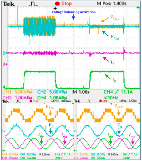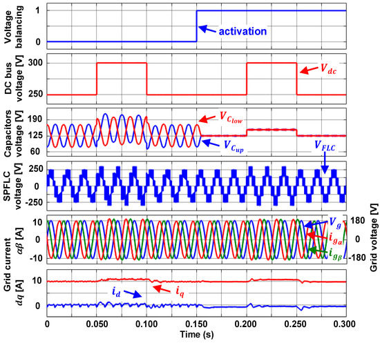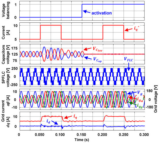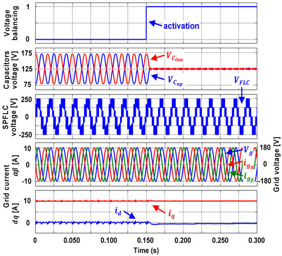 Figure 7 shows the performance of the voltage balancing strategy and the vector control technique for the proposed grid-tied SPFLC during a step-change of the quadrature grid current component from 5 A to and then returned back to 5 A. Thanks to the decoupling of the current loops, the axis current component properly remains at zero during all the simulation time, in spite of the step-changes carried out in the axis. It can be observed how the voltage unbalance of the DC-link split capacitors increases with . However, it is quite well-compensated after the activation of the balancing strategy at = 0.15 s.