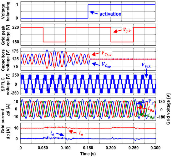 Figure 8 shows the performance of the voltage balancing strategy and the vector control for the proposed SPFLC during a grid voltage sag/swell. In this test, the peak value of the grid voltage was step-changed from 220 V to 180 V, thus representing a sag of 18%. After 50 ms, is returned back to 220 V, equivalent to a swell of around 22%. It can be observed that the voltage unbalance is inversely proportional with . However, thanks to the balancing strategy activated at = 0.15 s, the voltage unbalance is fairly well-regulated, thus accurately maintaining the voltage of split capacitors at 125 V from half the time scale. The good performance of the vector control for maintaining a constant and undisturbed grid current component during the step-changes of is noteworthy.