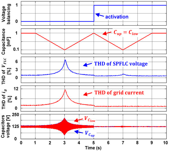 Figure 10 shows the dynamic response of the voltage balancing strategy and the vector control for the proposed grid-tied SPFLC during a sweep of the capacitance and of the DC-link split capacitors. In this test, = was varied following a triangular waveform, with peak values of 1 mF and 100 μF. It can be observed how the voltage unbalance as well as the THD of the output voltage from the SPFLC and, in turn, the THD of the grid current increase nonlinearly with the linear reduction of such capacitance. Therefore, the maximum values of voltage unbalance and harmonic distortion occur at = 3 s and = 7 s, i.e., the points of minimum capacitance. It is noteworthy how after the activation of the voltage balancing strategy at half the time scale, i.e., = 5 s, the voltage unbalance decreases from 125 V ± 85 V to only 125 V ± 7 V, whereas the maximum THD of and reduces from 6.9% and 11.4% to only 1.5% and 1.4%, respectively. This considerable reduction in the harmonic content of and clearly shows the significant power quality improvement achieved, thanks to the inherent capability of the proposed SPFLC for properly balancing the voltage of DC-link split capacitors. During this test, the direct and quadrature grid current components have been maintained constant at = and = .
