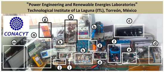 Experimental setup built in the laboratory; (a) novel single-phase five-level converter and its drivers; (b) auxiliary DC voltage sources; (c) grid connectors board; (d) line inductor; (e) Tektronix Hall current probes; (f) grid variable autotransformer; (g) multimeters; (h) voltage/current Hall sensors and signal conditioning stage; (i) DSP/FPGA-based control cards; (j) control dashboard; (k) Hewlett Packard programmable DC voltage source; (m) PC—Windows 10/i7/8 Gb RAM; and (n) Tektronix/Agilent digital scopes and Fluke 43B.