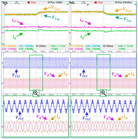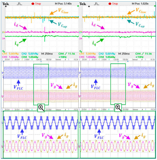 In Figure 6, the response of the grid current control as well as of the strategy for balancing the voltage of the DC-link split capacitors in the proposed five-level converter, during steady state of the grid currents, can be observed. It is noteworthy how from half the time scale, i.e., = 0.15 ns, when the voltage balancing is activated, the voltage unbalance of capacitors is fairly well compensated. In a very short-time, lower than 5 ms, the voltage of both capacitors practically achieves an overlapping at the constant level of . Note also how the negative slope at state 2 and the positive slope at state 4 of the SPFLC output voltage are properly corrected in a similar way, thus becoming a symmetrical and high-quality waveform. Figure 6 further shows the good performance of Ziarani’s PLL for deriving the grid current component and, in turn, of the resulting vector control for duly regulating the direct and quadrature currents to zero and 10 A, respectively. It is important to remark how the component properly lags the grid current by 90°, while it is accurately maintained out-of-phase with the grid voltage . During this test, the capacitance of the upper and lower DC-link split capacitors has remained constant at = = 200 μF.