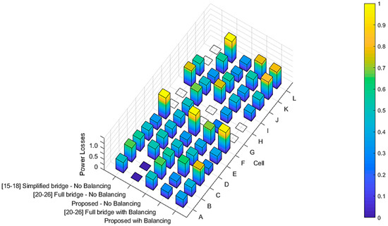 Figure 18 shows the first figure of merit based on the power losses distribution for three different single-phase five-level NPC converters, both with and without the voltage balancing of the DC-link split capacitors. In order to perform a fair and straightforward comparison, the magnitude of the power losses was normalized by considering all the results at once. Likewise, for ease of analysis, the cells’ notation with the letters A–L in Figure 18 matches the description of the power devices within the topologies of Figure 1. The term cell denotes either the set of a switch with its antiparallel free-wheeling diode or a simple neutral clamping diode. Note that the cells G-H are only present in the full-bridge topology [20,21,22,23,24,25,26], whereas the cells K-L are only not present in the conventional simplified-bridge topology [15,16,17,18].