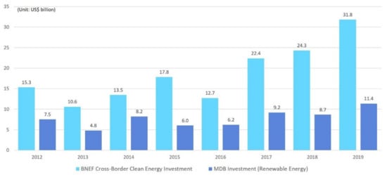 Private investment has taken the lead in renewable energy finance globally during the last decade. For example, it accounted for 92% (US$242 billion) of the total renewable energy financing made in 2016 [] and reached US$277 billion in 2018 []. Although most private investments are used for domestic projects [], cross-border private investment for developing countries still exceeds the MDBs’ investment (Figure 1). While the aggregate of renewable energy investment of eight major MDBs (ADB, AfDB, Asian Infrastructure Investment Bank, EBRD, EIB, IADB, IsDB, and the World Bank Group) was US$7.8 billion per year between 2012 and 2019 [,,,,,,,], the cross-border private investment was US$18.6 billion per year during the same period []. Moreover, the evident increasing trend suggests that cross-border private investment will continue to increase.