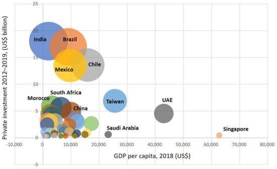 However, as shown in Figure 2, cross-border private investment tends to be allocated favorably to higher-income developing countries. Out of US$148.4 billion invested by the private sector between 2012 and 2019, almost 70% went to five countries: India (lower-middle-income), Brazil (upper-middle-income), Chile (high-income), Mexico (upper-middle-income), and Taiwan (high-income). Of the 27 countries receiving more than US$1 billion, upper-middle-income countries represented the highest share (13 countries, 43.3%), followed by lower-middle-income countries (8 countries, 26.7%), high-income countries (5 countries, 16.7%), and low-income countries (1 country, 3.3%). While private investment prevails in North America, Oceania, Western Europe, and East Asia [], less than 10% of global private investment in renewable energy flowed into South Asia, Sub-Saharan Africa, Latin America, and the Caribbean between 2013 and 2016 []. In brief, many low-income countries still have difficulties attracting private finance to stimulate their renewable energy sector [], and public finance remains a critical source of renewable energy investment in these countries [].