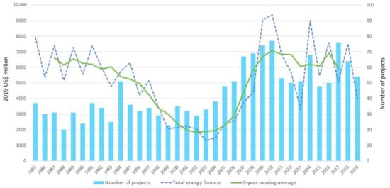 Total energy finance and number of energy-related projects (1985–2019). Source: authors’ illustration based on [].